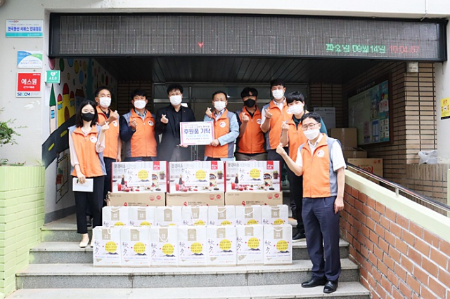 이날 한전 노사합동 봉사단은 코로나19 예방수칙을 철저히 준수하며, 관내 20여 곳에 한과 다과 세트와 김 등 반찬 나눔 활동을 시행하였다.