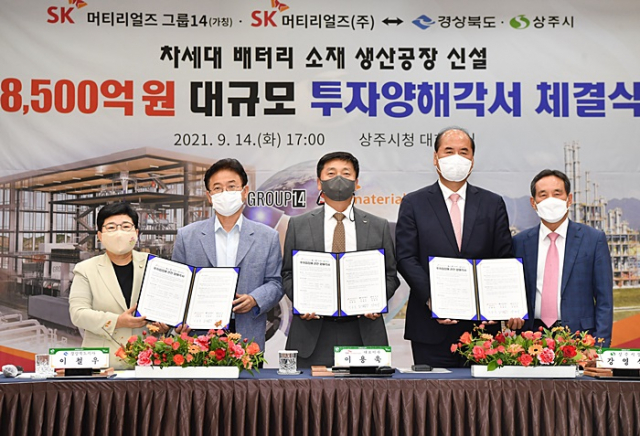 경상북도와 상주시는 14일 상주시청에서 SK머티리얼즈 그룹14(가칭, 이하 합작회사) 및 SK머티리얼즈의 이차전지 배터리용 실리콘 음극재 및 원재료 생산공장 신설을 내용으로 하는 투자양해각서(MOU)를 체결했다고 밝혔다.