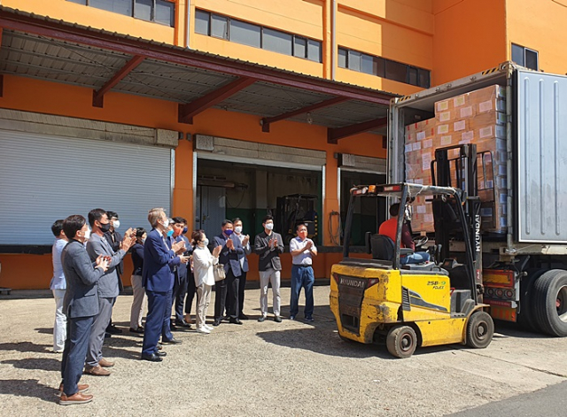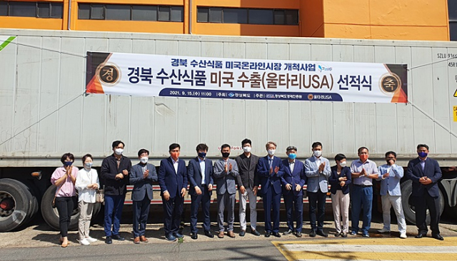 경상북도는 15일 포항 대일씨앤에프 물류창고 앞에서 지역 수산기업 13개사의 수산식품을 울타리USA(신상곤 대표)를 통해 미국으로 수출하는 선적식 행사를 진행했다.
