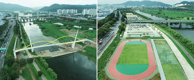 | ↑↑ 금호강 하중도의 보도교(좌), 주차장(우) |