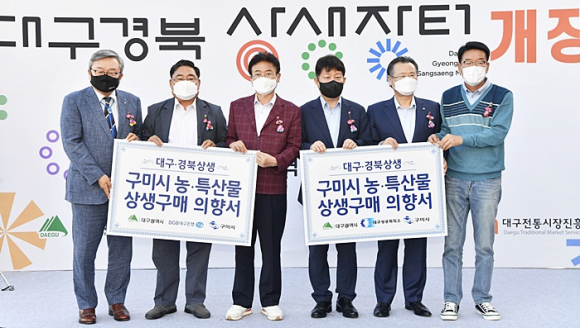 ↑↑ 이재하 대구상공회의소 회장, 임성훈 대구은행장이 구미농민대표에게 구미지역 농특산물의 적극 구매 약속하는 상생구매의향서를 전달했다.