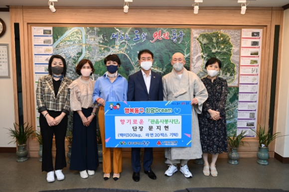 관음사 봉사단(단장 문지현)이 지난 15일, 백미 300kg과 라면 20박스를 동구청에 기탁했다.