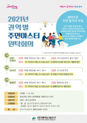 대구 달서구(구청장 이태훈)는 새로운 정책 아이디어 발굴을 위한 ‘2021년 권역별 주민마스터 원탁회의’ 참여자를 10월 6일까지 모집한다.