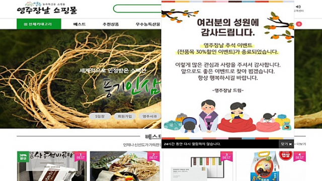 영주시는 공식 농특산물 온라인 쇼핑몰인 ‘영주장날(www.yjmarket.com)’이 지난달 17일부터 시행한 추석맞이 30% 할인행사에서 3억 8천만원의 매출을 달성했다고 밝혔다.