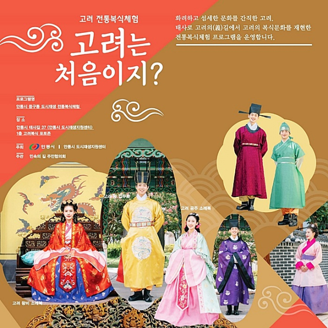 안동시가 주최하고 안동시도시재생지원센터와 민속의길 주민협의체가 주관하는 고려의(義)길 고려전통복식 체험프로그램 “고려는 처음이지?”가 안동시 도시재생지원센터 1층 다목적 홀에서 11시부터 17시까지 4주간 7회에 걸쳐 무료로 운영된다.