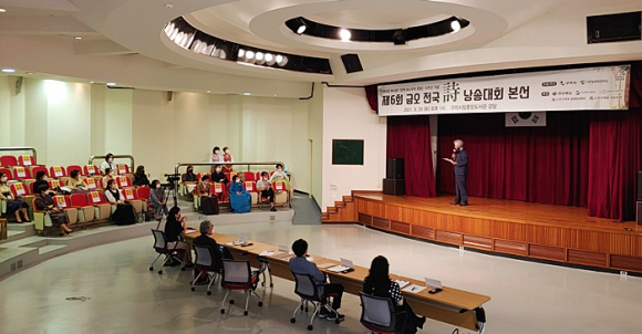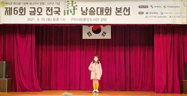 구미시(시장 장세용)에서는『제6회 금오전국시낭송대회』가 지난 25일구미시립중앙도서관 강당에서 개최되었다. 전국에서 시낭송 애호가와 청소년 등 350여명이 예선에 참가, 치열한 예심을 통과한 45명이 이날 본선 대회에서 각자 아름다운 낭송을 뽐내며 열띤 경연을 벌였다.