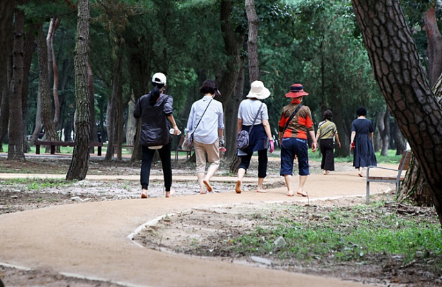 경주시가 신라 천년숲 황성공원에 시민들의 건강증진을 위해 조성한 ‘천년 맨발길’이 큰 호응을 얻고 있다. 시는 1억2000만원의 사업비를 들여 지난 6월에 착공해 이달 초 맨발길을 완공했다.