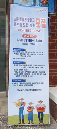 한편, 일손이 부족한 농가와 일자리를 희망하는 군민이라면 누구나 농촌인력지원센터(예천읍 군청길 11, ☎054-652-3252)를 통해 상담과 도움을 받을 수 있다.