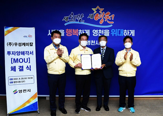 이날 투자유치 MOU를 체결한 ㈜우성케미칼은 영천시 북안면 소재로 약 50억원을 투자하여 대기업에 납품할 친환경수지 생산을 위한 라인을 추가로 구축하고 12명을 신규 고용할 예정이다.