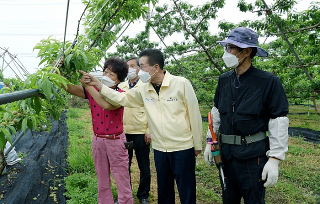 | ↑↑ 영천시 농촌인력지원센터의 중개로 인력을 지원받아 적과 작업이 한창인 남부동 복숭아재배 농가에 최기분 영천시장 방문 격려하였다 |