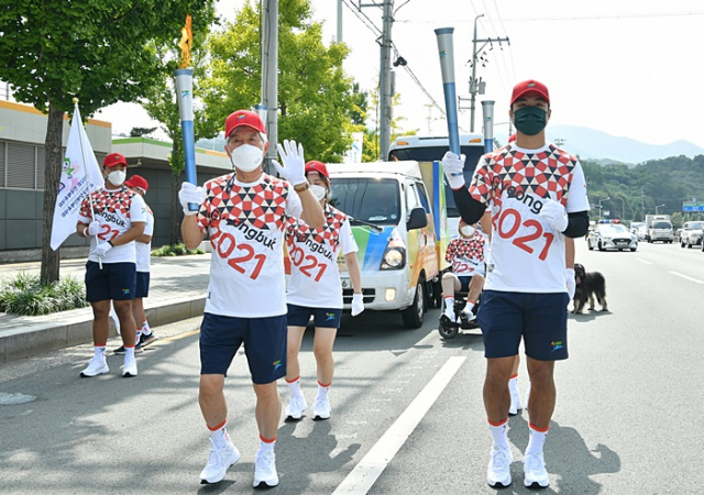 이날 행사는 코로나19 확산 방지를 위해 철저한 방역 대책 아래 진행되었으며, 경산시청 앞 남매지 야외공연장에서 최영조 경산시장, 봉송 주자 등 50여 명이 참석한 가운데 성공적인 대회를 기원하는 퍼포먼스, 성화 인수식 등 성화 봉송 환영식을 했다.