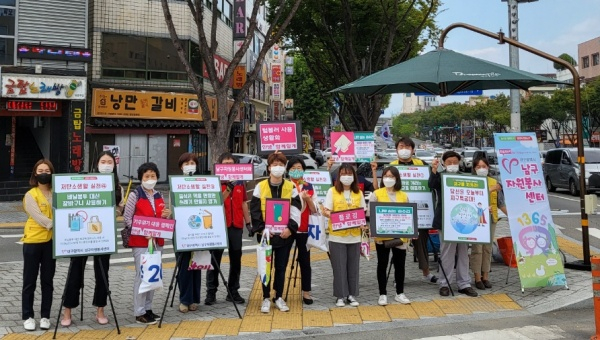대구남구자원봉사센터(센터장 김봉기) 새싹봉사단(회장 김성숙), 어우름대학생 봉사단(회장 오성준), 영남이공대학교 아이사랑 동아리(회장 서영채) 등 20여 명은 7일 오후 2시 영대병원네거리 일원에서 기후위기대응 ‘안녕 함께할게’ 캠페인을 벌였다.