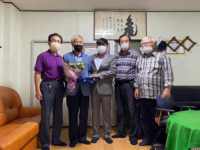 | ↑↑ 하양분회경로당 총무 김영복씨(왼쪽 두번째) 모범어르신으로 표창패 받았다 |