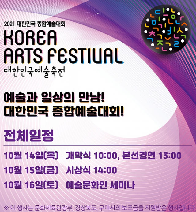 구미시(시장 장세용)는 구미문화예술회관에서 10월 14일부터 10월 15일까지 (사)한국예술문화단체총연합회(대표 이범헌) 주관으로 2021 대한민국예술축전을 개최한다.