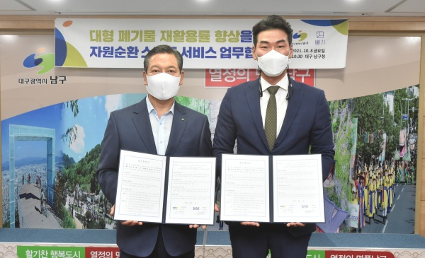 대구광역시 남구청(구청장 조재구)과 ㈜같다는 10월 8일 모바일 대형폐기물 수거신청 서비스 도입을 위한 업무협약을 체결하고, 대형폐기물 배출 신청과 처리 결과 확인을 모바일로 간편하게 확인할 수 있는 국내 최초 인공지능 대형폐기물 배출 서비스 앱 ‘빼기’ 도입에 협력하기로 했다.
