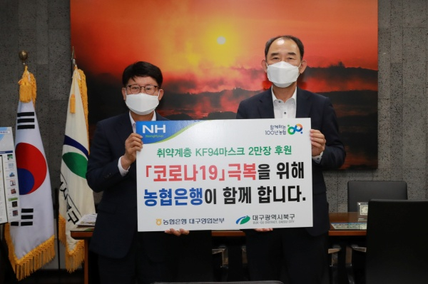 NH농협은행 대구영업본부(본부장 박병희)는 10월 12일(화) 대구 북구청(청장 배광식)을 방문하여 코로나19로 어려움을 겪고 있는 취약계층을 위해 사용해 달라며 KF94 마스크 2만 장(400만 원 상당)을 기탁했다.