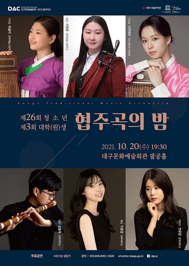 대구시립국악단(예술감독 겸 상임지휘자 이현창)은 제26회 청소년 협주곡의 밤 및 제3회 대학(원)생 협주곡의 밤을 오는 10월 20일(수) 대구문화예술회관 팔공홀에서 개최한다. 고등학생에서부터 대학원생까지 국악 유망주들의 연주를 폭넓게 감상할 수 있는 공연이다.