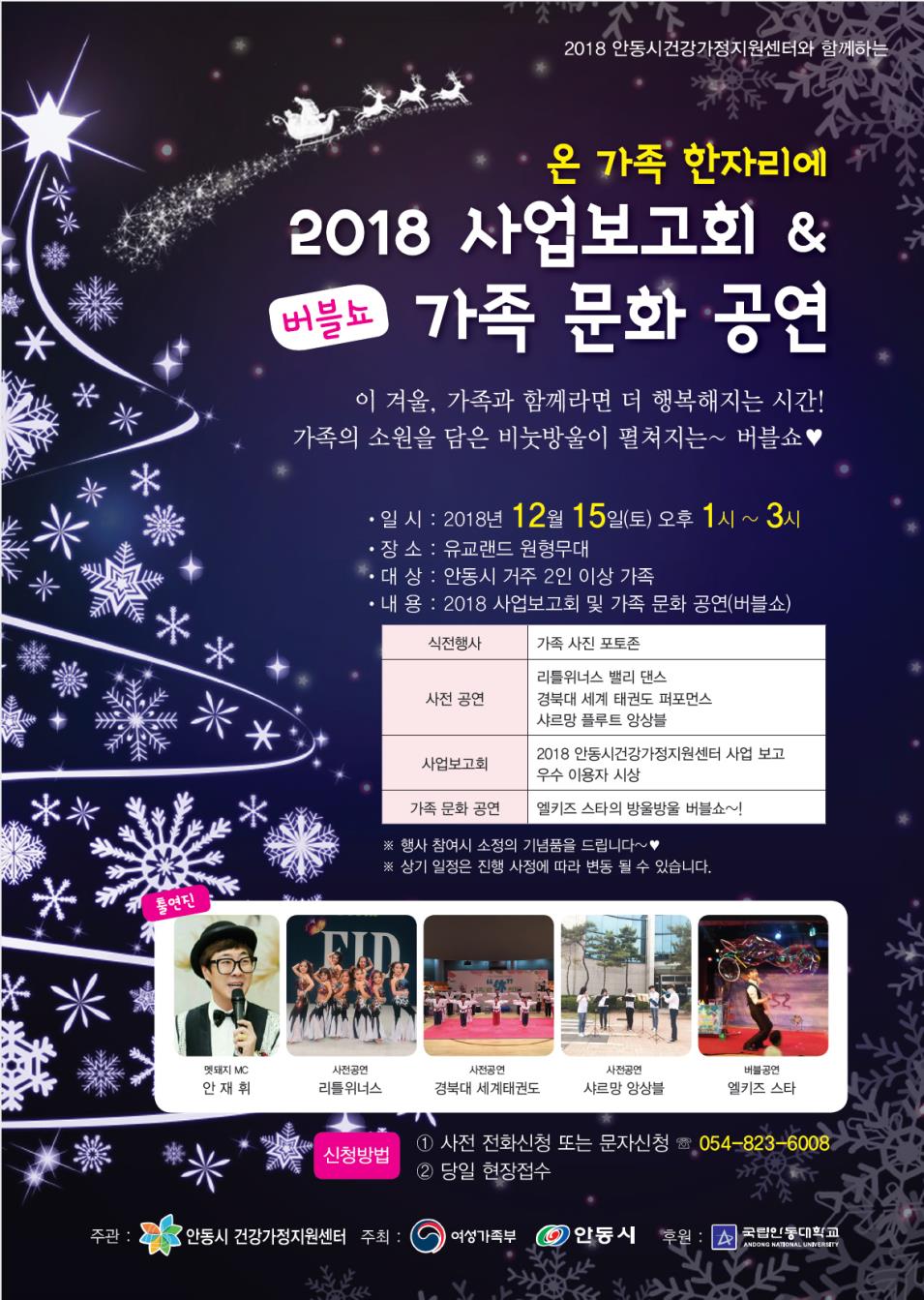 안동시와 안동시건강가정지원센터는 오는 15일(토) 오후 1시 유교랜드 원형무대에서 ‘2018 온 가족 한자리에’라는 주제 올 한 해 동안 행복한 가정문화를 만들기 위해 펼쳤던 다양한 사업들을 소개하는 시간과 함께 가족문화공연 행사를 개최한다.