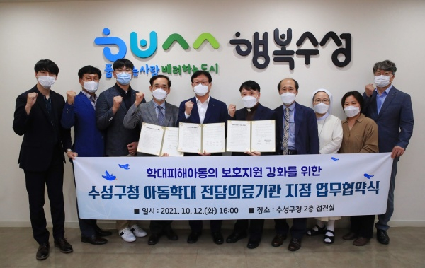 대구 수성구(구청장 김대권)은 지난 12일 학대 피해 아동의 신속하고 체계적인 의료 지원을 위해 총 4개의 의료기관을 아동학대 전담의료기관으로 지정하고 업무협약을 체결했다.