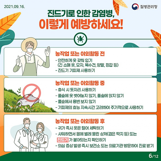 가을 농번기 대표적인 감염병 중 하나인 쯔쯔가무시증은 털진드기 유충에 물려 감염되며 80%이상이 9~11월에 발생하는데, 주로 10월 초부터 급증하기에 각별한 주의가 필요하다. 증세로는 1~3주 이내에 고열과 오한, 검은 딱지 등의 증상이 나타날 수 있다.