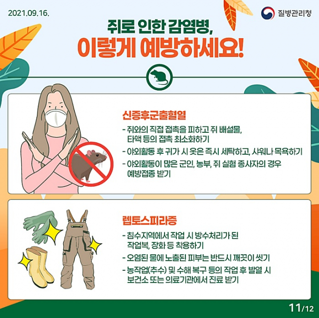 이밖에도 쥐와 같은 설치류에 의해 전파되는 감염병도 가을철에 발생률이 증가하는데, 신증후군출혈열의 경우 예방접종을 통해 예방할 수 있으며, 렙토스피라증의 경우 오염된 물에 피부를 노출하지 않는 것이 중요하다.