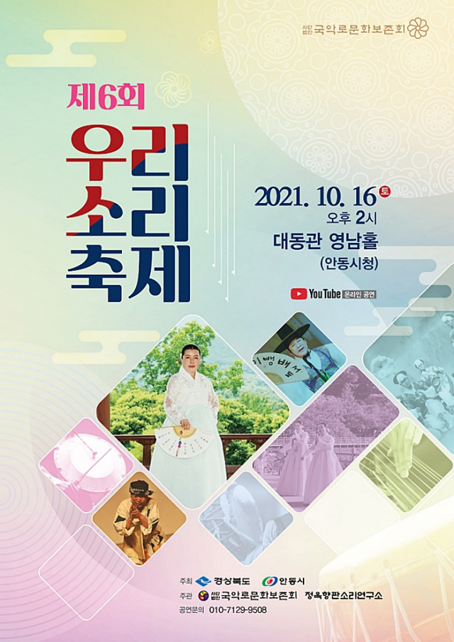 경상북도와 안동시가 주최하고 (사)국악로문화보존회가 주관하는 '제6회 우리소리축제'가 2021년 10월 16일 오후 2시 안동시청 대동관 영남홀에서 열린다. 이번 제6회 우리소리 축제는 코로나19 확산 방지 및 방역을 위해 비대면 공연으로 진행되며 유튜브 방송으로 시청할 수 있다