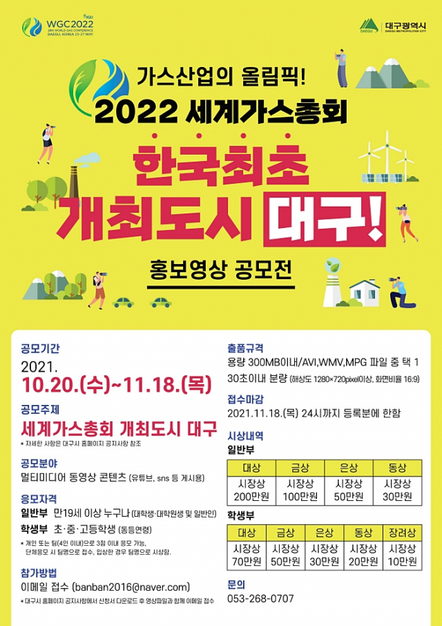 이번 공모전은 ‘2022 대구 세계가스총회’의 성공적인 개최를 기원하고 개최도시 대구를 적극 홍보하며, 나아가 탄소중립 선언으로 촉발된 친환경 에너지 시대의 지속 가능한 미래 모색에 대해 전 세대의 관심도를 높이기 위한 취지로 기획됐다.