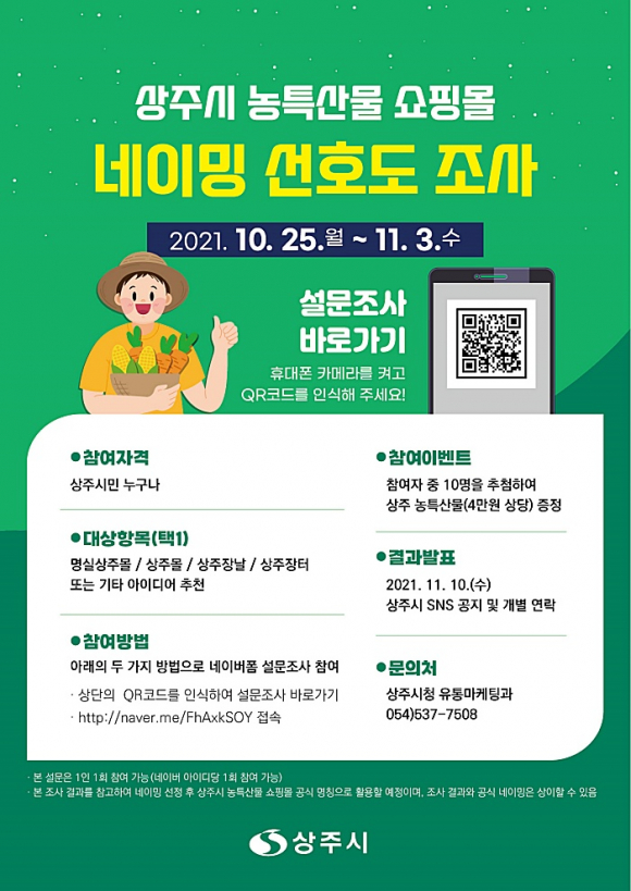 상주시는 지역 농특산물의 온라인 판로 확대를 위해 개발 중인 농특산물 온라인 쇼핑몰의 공식 명칭을 선정하기 위해 상주 시민을 대상으로 네이밍 선호도 조사를 진행한다고 밝혔다. 오는 25일부터 다음달 3일까지 진행되는 선호도 조사에서는 “명실상주몰”, “상주몰”, “상주장날”, “상주장터” 등 네 가지 명칭 중 하나를 선택하면 된다.