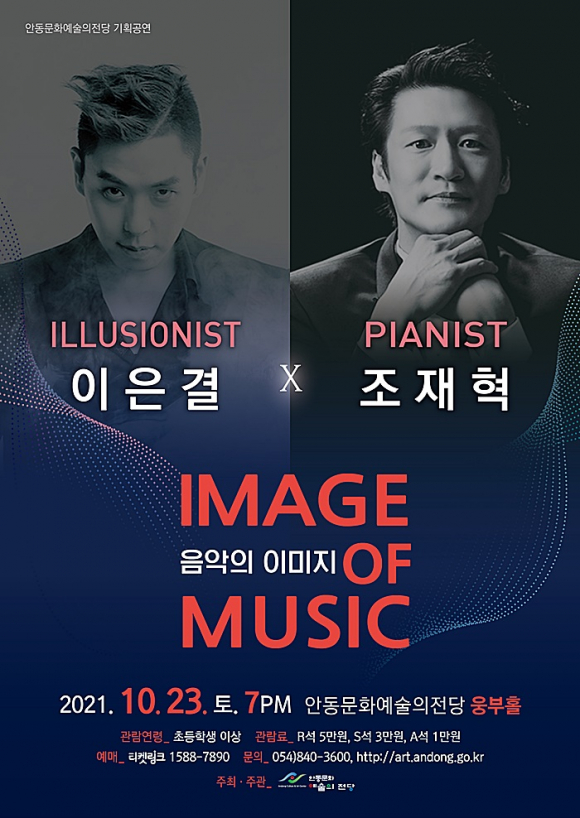 안동문화예술의전당 기획공연‘음악의 이미지 – IMAGE OF MUSIC’은 코로나19 사회적 거리두기 지침을 준수하여 진행되며 관람료는 R석 5만 원, S석 3만 원, A석 1만 원으로 자세한 내용은 전화 ☎840-3600번 또는 안동문화예술의전당 홈페이지(Http://art.andong.go.kr)로 확인할 수 있다.