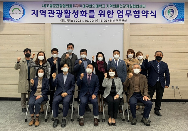 사단법인 고령군관광협의회(회장 이상용)와 대구한의대 지역의료건강지원협업센터(센터장 양은주)는 10월 20일 오후 3시 인빈관 주산실에서 업무협약을 체결했다. 이번 협약으로 양 기관은 지역 관광 활성화를 위하여 상호간 협력을 강화하기로 했다.