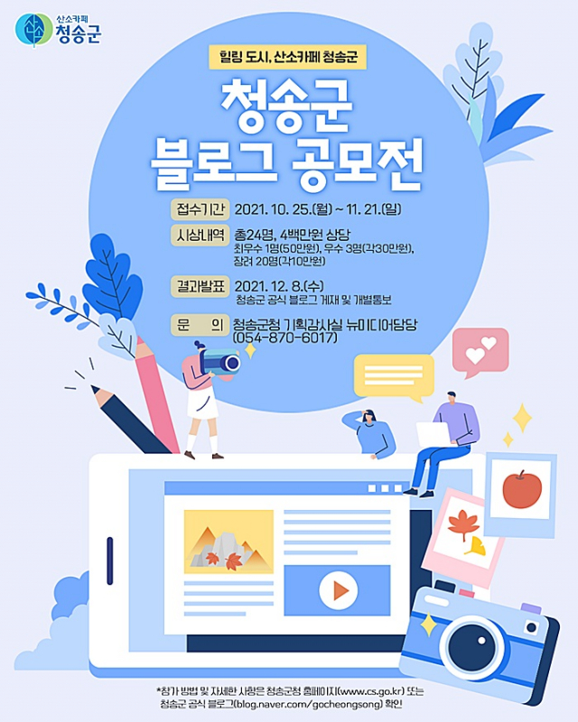 공모기간은 10월 25일부터 11월 21일까지로, 참여 방법은 2020년 11월 23일 ~ 2021년 11월 21일까지 공모전 주제에 맞게 직접 취재·제작한 포스팅을 참가신청서에 작성해 11월 21일까지 제출하면 된다. 참가신청서 다운로드나 참가 방법 및 자세한 내용은 청송군 홈페이지나 공식 블로그에서 확인 할 수 있다.