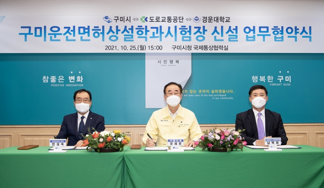 구미시(시장 장세용)는 10월 25일(월) 구미시청 1층 국제통상협력실에서 장세용 구미시장, 남택화 도로교통공단 운전면허본부장, 한성욱 경운대학교 총장 3개 기관의 대표가 참석한 가운데 구미운전면허상설학과시험장 신설을 위한 업무협약을 체결했다.
