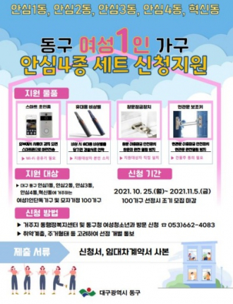 대구 동구청(구청장 배기철)이 여성1인 가구의 안전한 주거생활을 위해 ‘여성1인 가구 안심4종세트 지원사업’을 실시한다.