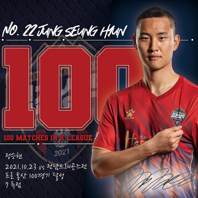 김천상무프로축구단(대표이사 배낙호)이 23일 오후 6시 30분 김천종합운동장에서 열린 ‘하나원큐 K리그2 2021’ 35R 전남드래곤즈와 홈경기에서 3대 1로 역전승을 거뒀다. 이날 주장으로 선발 출전한 정승현은 팀의 두 번째 득점을 성공시키며 역전승에 기여했다. 특히 정승현은 이날 개인 프로통산 100경기를 달성하는 영광을 누렸다.