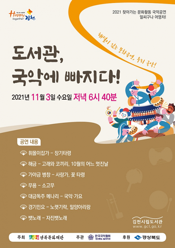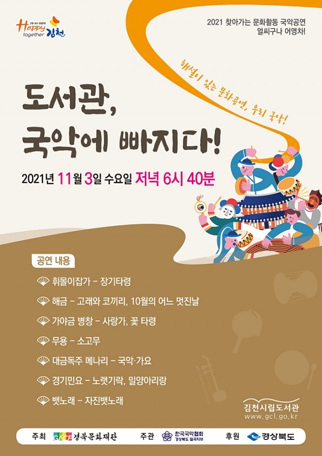 김천시립도서관(관장 백선주)에서는 오는 11월 3일, 해설이 함께 하는 국악 공연「도서관, 국악에 빠지다!」를 개최한다고 밝혔다.