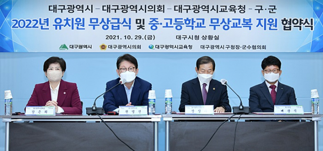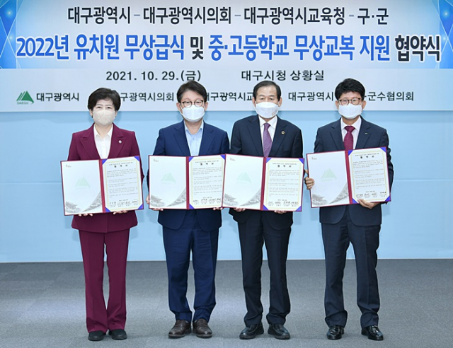 대구시는 2022년 유치원 급식비 지원으로 유·초·중·고등 전 교육과정의 무상급식 실시와 중·고등학교 신입생에게 교복비를 지원한다.