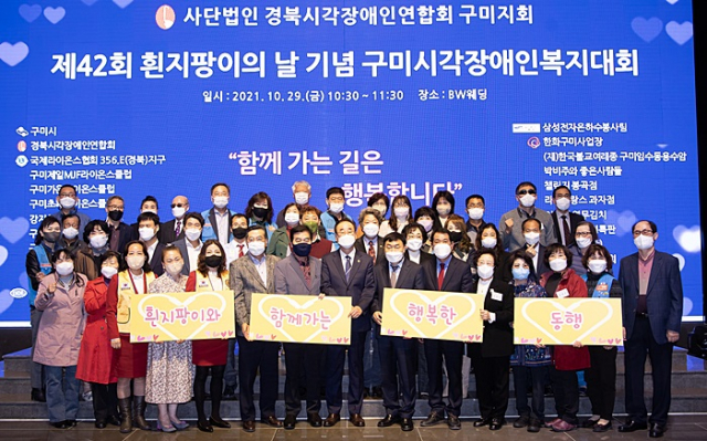 구미시(시장 장세용)에서는 10. 29.(금) 10:30 BW웨딩에서 장애인 복지 증진 유공자, 시각장애인 등 50여명이 참석한 가운데, 사)경북시각장애인연합회 구미지회(회장 양성재) 주관으로 「제42회 흰지팡이의 날 기념 구미시각장애인복지대회」를 개최하였다.