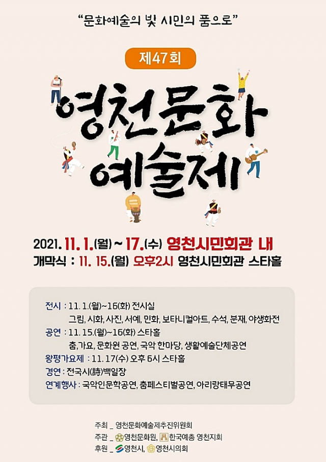 영천문화예술제추진위원회는(위원장 정연화, 김춘도) 1일부터 17일간 시민회관에서 제47회 영천문화예술제를 온오프라인으로 개최한다.
