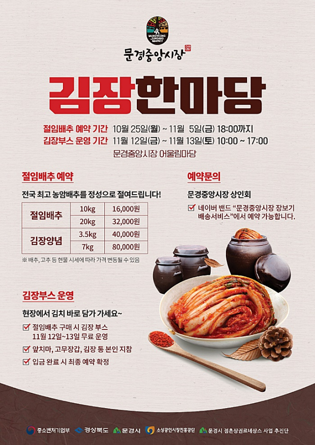 지역 특산물인 ‘농암배추’를 활용한 절임배추와 김장양념을 10월 25일부터 11월 5일까지 저렴한 가격에 예약 구매할 수 있으며 현장에서 바로 김장을 희망하는 고객들을 위해 문경중앙시장에서는 김장부스 활용희망고객을 모집하여 11월 12일부터 13일까지 양일에 걸쳐 어울림마당 내 준비된 김장부스를 무료로 제공한다.