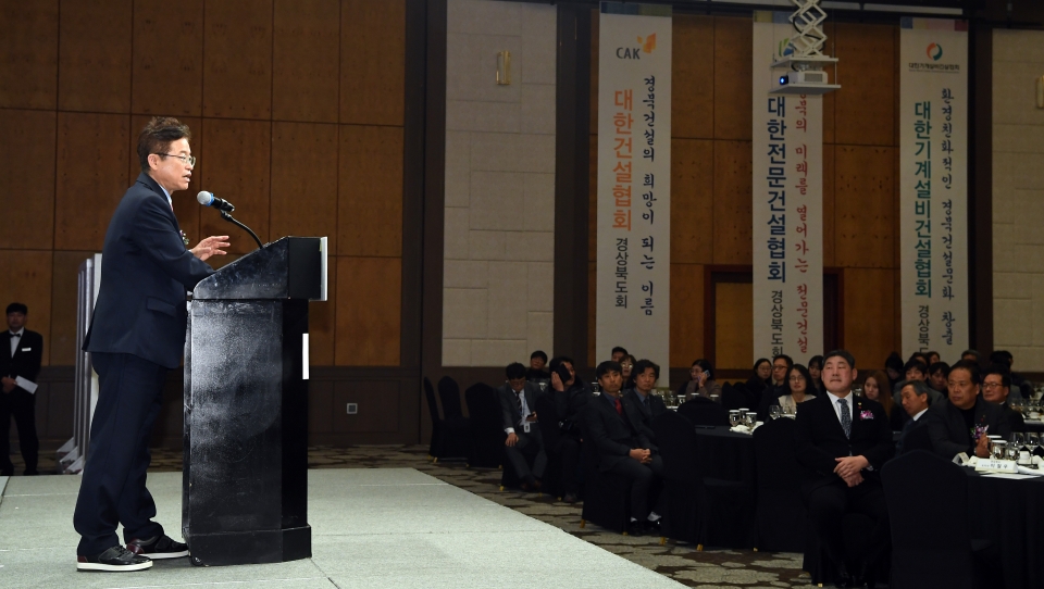 이철우 경북도지사가 건설인 기살리기 및 건설인상 시상식에서 격려사를 하고 있다.