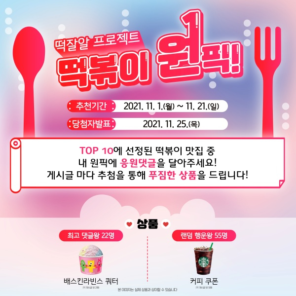 이와 함께 11월 4일부터 11월 21일까지는 「내 떡볶이는 내가 찍는다 '내떡내찍' 인증샷 이벤트」도 함께 진행한다. TOP 11 업체에 방문하고 인증샷을 찍은 후 자신의 인스타그램에 방문 인증샷과 필수 해시태그를 올리면 된다.