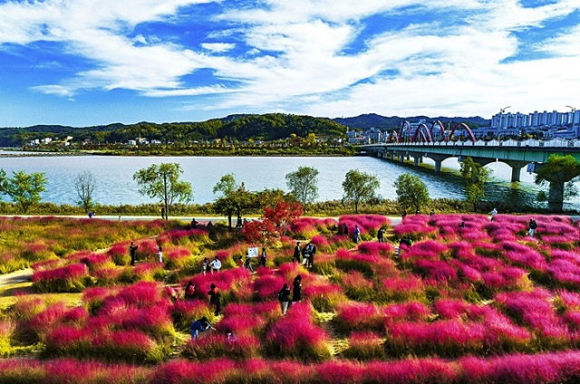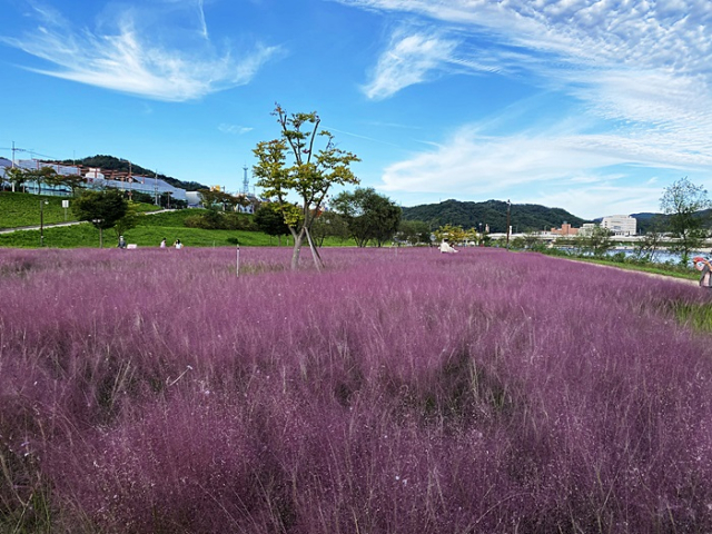 핑크빛으로 물든 낙동강변이 이채롭다. 강변 둔치에 대규모로 꾸며진 “핑크뮬리 그라스원”은 편리한 교통 접근성으로 가족 나들이에 최적의 장소이다. 드넓은 분홍빛의 핑크뮬리 꽃밭을 배경으로 다양한 포토존을 담고 있어 사람들의 발길이 끊이지 않고 있다.