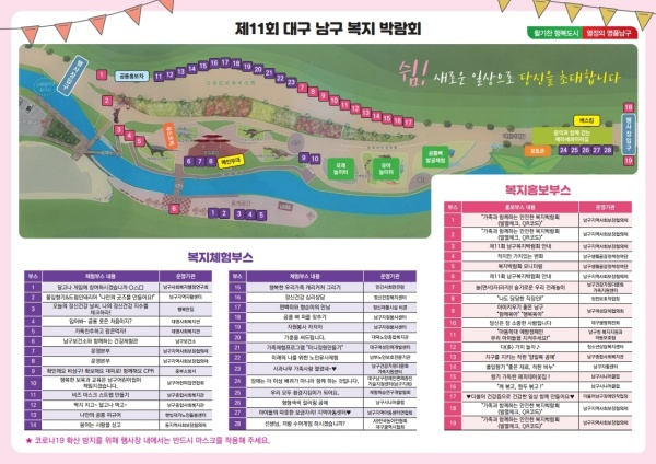 대구 남구청이 주최하고 남구 지역사회보장협의체가 주관하는 『제11회 남구 복지박람회』가 “쉼! 새로운 일상으로 당신을 초대합니다.”라는 슬로건 하에 고산골 공룡공원에서 개최된다.