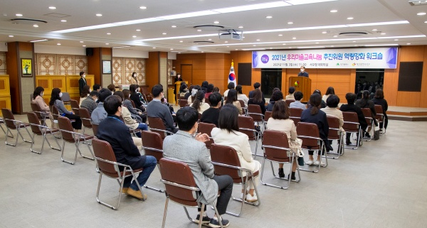 대구 서구(구청장 류한국)는 11월 3일, 오전 11시 서구청 대회의실에서 15개동에서 추진하고 있는 우리마을 교육나눔사업의 추진위원 50여 명이 참석한 가운데 ‘2021년 우리마을 교육나눔 추진위원 역량강화 워크숍’을 개최했다.