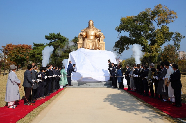 경주시는 황성공원 내 한중우호의 숲 인근에 신라 시조 박혁거세 동상과 탄생설화 조형물 설치사업을 완료하고 4일 제막식을 열었다.