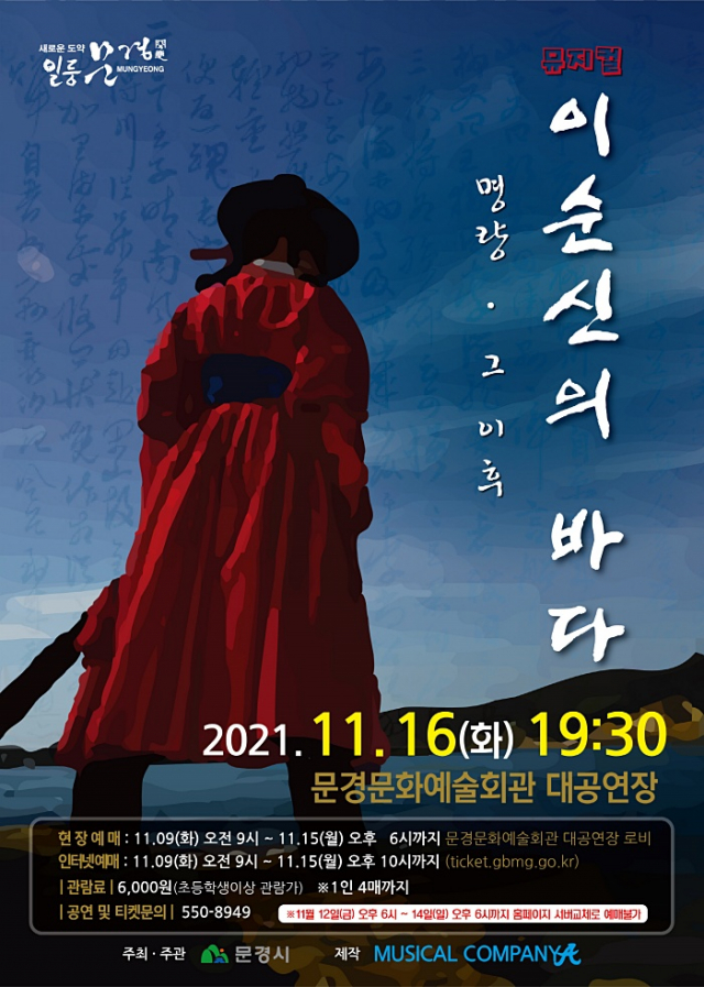 문경문화예술회관은 이순신 장군의 일대기를 다룬 뮤지컬 ‘이순신의 바다’ 공연이 오는 11월 16일(화) 오후7시30분 문화예술회관 대공연장 무대에 올린다.