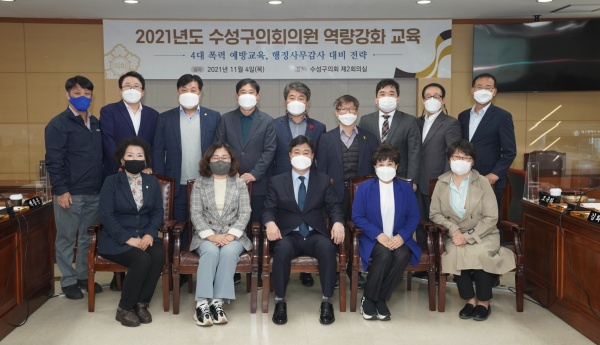 대구 수성구의회(의장 조용성)는 지난 4일 수성구의회 제2회의실에서 의원 의정활동 역량강화를 위해 전문가를 초청해 전체의원을 대상으로 4대 폭력예방 교육과 행정사무감사 대비 전략 특강을 실시했다.