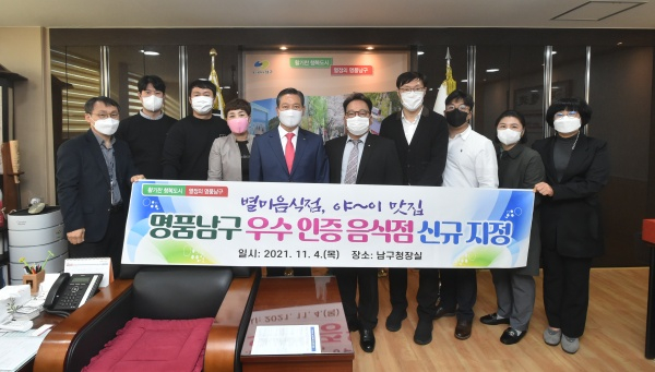 대구 남구(구청장 조재구)는 지난 11월 4일 지역을 대표하는 우수 인증 음식점 7곳을 신규 지정하고, 영업주를 초청해 지정증과 표지판을 전달했다고 밝혔다.