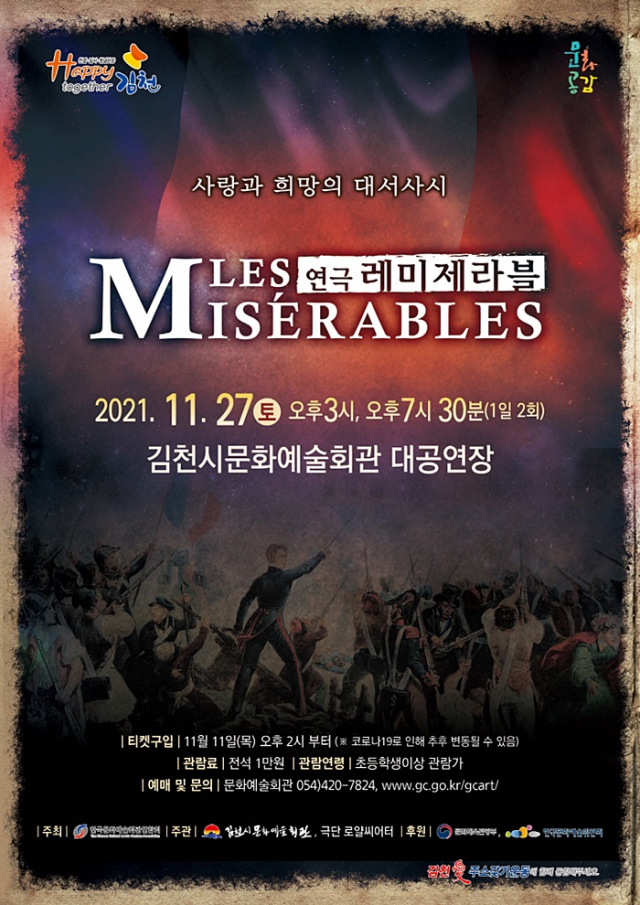 김천시 문화예술회관(관장 신동균)에서는 기획공연 연극‘레미제라블’을 오는 11월 27일(토) 오후 3시, 오후 7시 30분 1일 2회에 걸쳐 문화예술회관 대공연장에서 개최한다.