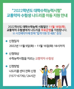 대구시설공단(이사장 최길영) 나드리콜은 2022학년도 대학수학능력시험일인 오는 11월 18일(목), 교통약자 수험생에게 나드리콜 무료운행을 지원한다.